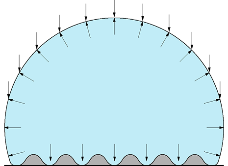 Dans les exemples précédents, on a considéré un emplissage exacte, c'est-à-dire juste suffisant pour atteindre le volume visé sans ajouter de pression autre que celle générée par le poids de la membrane. Bref, c'est la pression minimale possible. Malgré cela, on peut constater les grands écarts de tensions proportionnels à la pression. Si on l'augmentait, le rapport resterait le même.